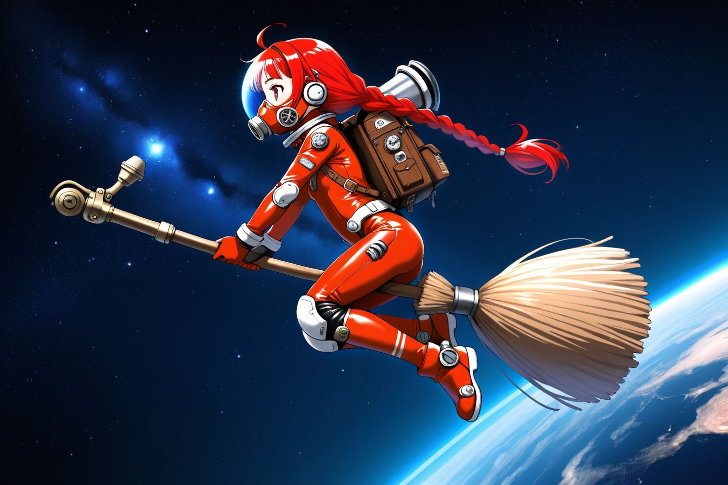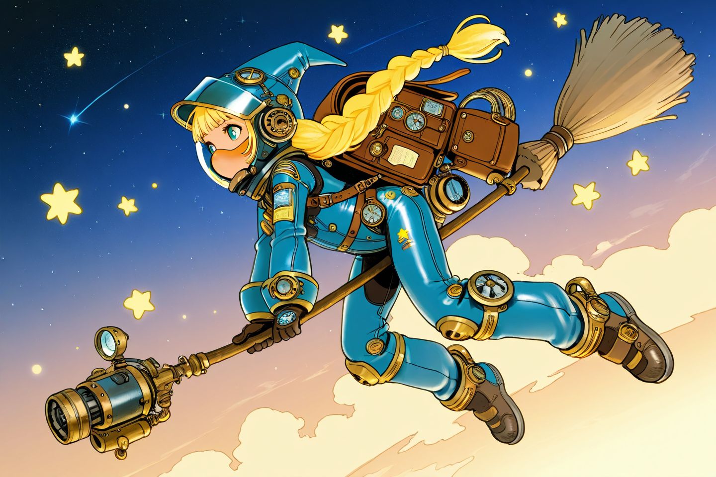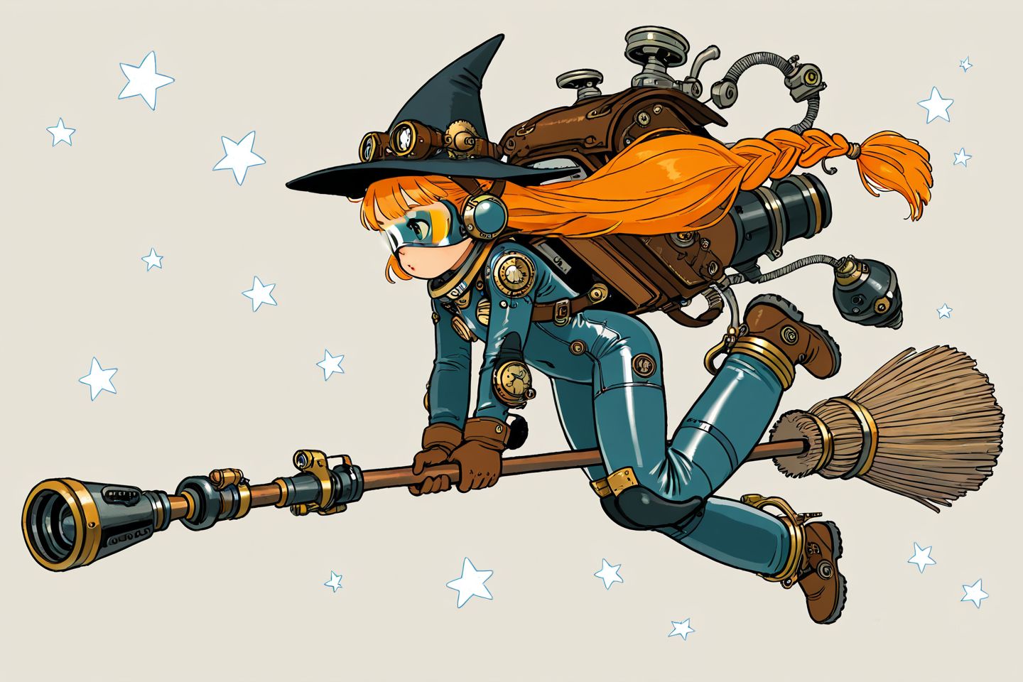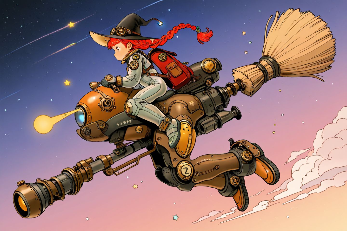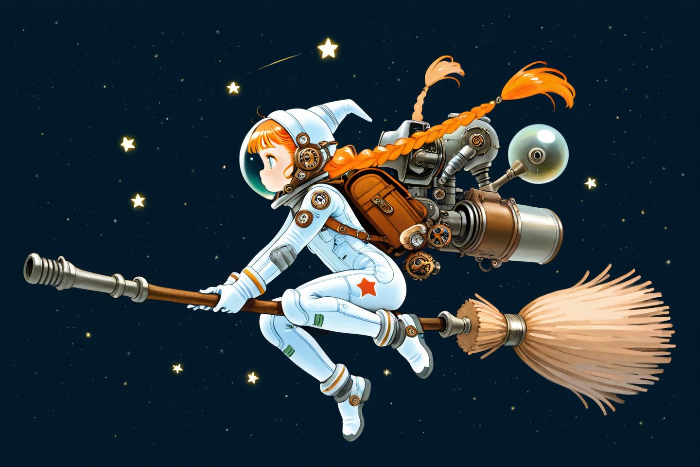 >>27311 Почему-то моделька упорно считает, что прутья должны быть по обоим концам древка метлы. Ну не глупица? А ещё почти все девочки летят справа налево. Из относительно удавшихся: Вот эта. Что-то напоминающее открытки из СССР с пионерами верхом на ракетах.