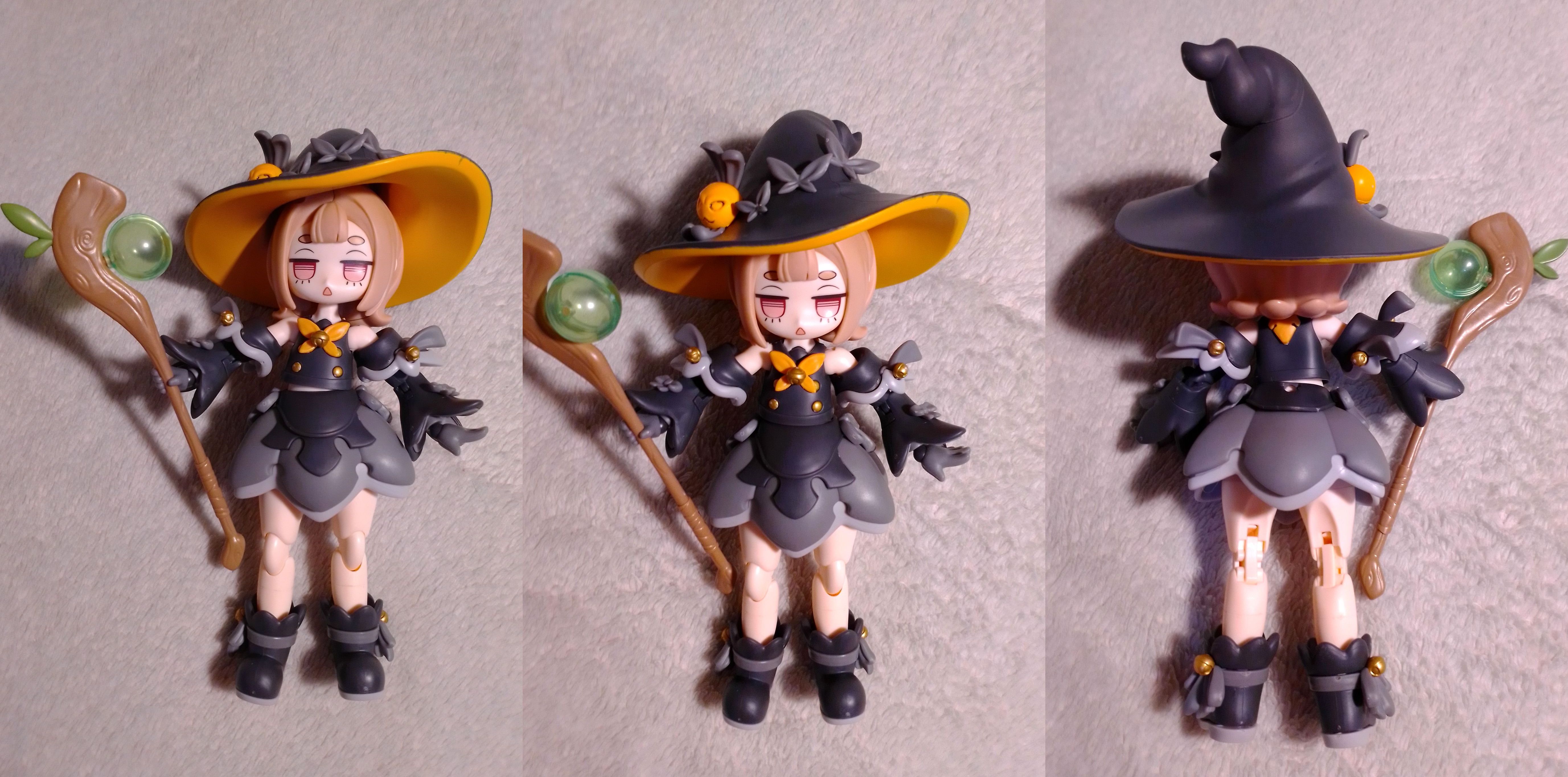 Приоделась. Всё хорошо, но… Из-за одёжки фигурка почти полностью теряет подвижность. Юбка цельная и ограничивает движение ног в тазобедренных суставах. Сапожки лишают подвижности стопы. Широченные рукава не дают поразмахивать руками. Шляпа тяжеленная. Фигурка стоит без подставки, но от любого дуновения норовит кувырнуться. Светло-серые детальки из резиноподобного пластика (вставки на голенищах сапог и обрамление подошв, внутренняя часть юбки) отлиты не шибко точно и в соединениях их с жёстким пластиком видны небольшие зазоры. Телесных шарниров для запястий всего один комплект и они намертво вщёлкиваются в кисти. Придётся сразу выбирать кулачки тебе нужны или растопырки-пятерни (растопырки лучше!). Продавец отдельно докинул маленький литничок с "усиленными" шарнирами. Но они все тёмно-серые. Видимо, родные не слишком прочные и народ жаловался, так что производитель решил заранее выдавать "ремкомплект"? Все придирки именно что придирки. А учитывая стоимость фигурки, придраться и вовсе глупо, как по мне. Мечницу оставлю на следующую пачку выходных. Ждём смелую Создательницу Тредов.